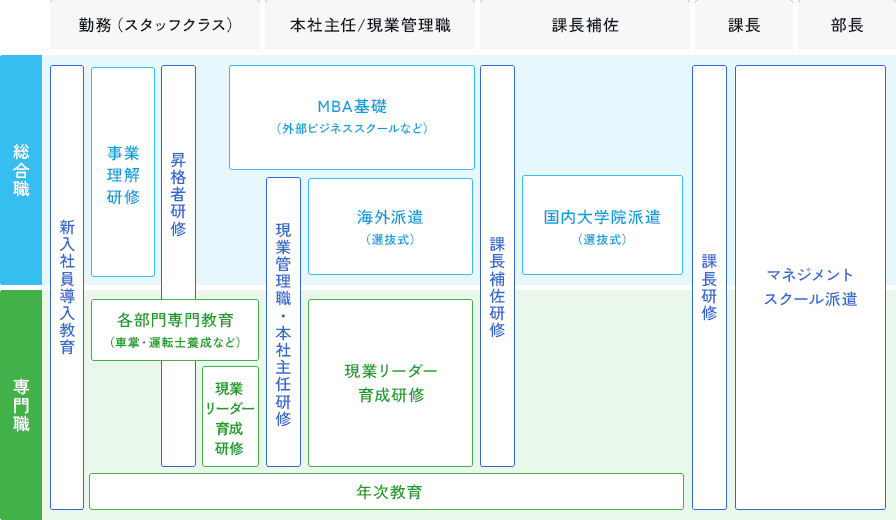 社員一人ひとりが、業務の専門性を高め経営戦略の達成に貢献できるよう、より良い仕事をするために必要なスキル・知識の修得に資する研修・支援体制があります。